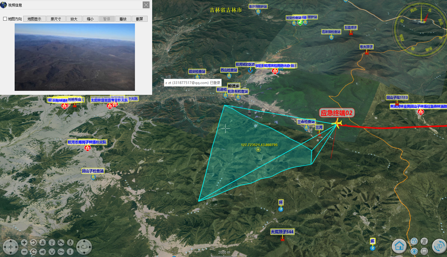 無人機/有人機在空中拍攝的現(xiàn)場圖像快速校正疊加到地理信息上,實現(xiàn)火場現(xiàn)場的實況顯示,并實現(xiàn)火場、火線、火頭、火面等火場的測量和態(tài)勢生成。