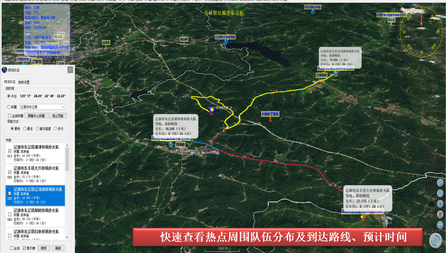自動計算、統(tǒng)計熱點附近的隊伍,取水點、道路山形、林業(yè)資源等,自動計算前行路線,自動預計到達時間,指揮中心匯聚多方信息在高清三維GIS圖上,供決策使用。